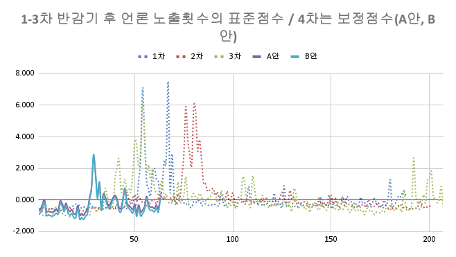 BIG KINDS라는 뉴스 분석 도구로 1주일 단위로 국내 언론 기사에서 '비트코인'이 얼마나 자주 언급됐는지 횟수를 정리하였어요. 그리고 과거 4번의 반감기 기간을 비교해보니, 특히 3번째 반감기 후 비트코인 가격이 최고일 때 '비트코인' 언급 횟수도 최고였어요. 그래서 이번 4번째 반감기 후에도 비슷한 시기에 가격이 최고가 될 거라고 예상하며 모니터링 중입니다.