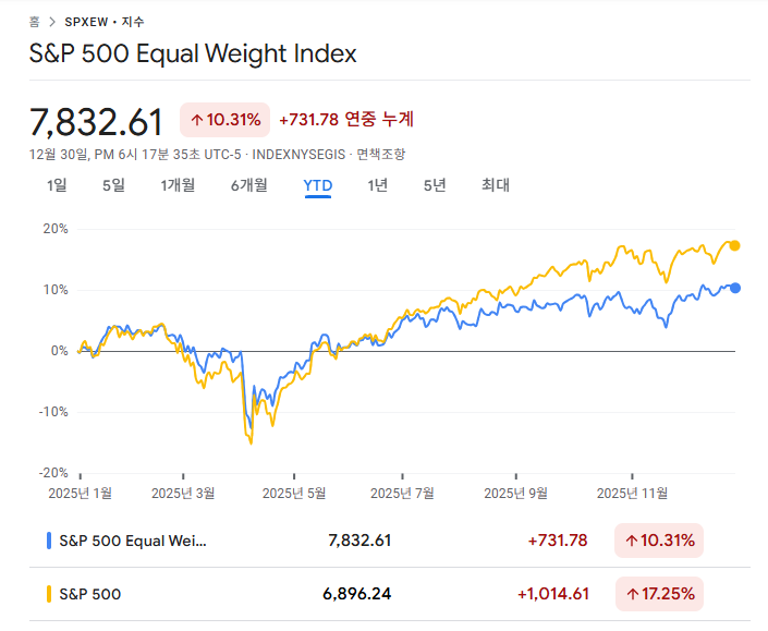 - 구글 파이낸스의 간편한 추이 비교는 초보 투자자들에게 유용한 도구임. 구글 검색창에 'SPY vs RSP'를 입력하거나 구글 파이낸스 페이지에서 두 종목을 추가하면 기간별 수익률 추이를 백분율(%) 단위로 즉시 대조해 볼 수 있음. 별도의 복잡한 설정 없이도 모바일과 PC에서 시장의 상대적 성과를 빠르게 파악할 수 있다는 장점이 있음.